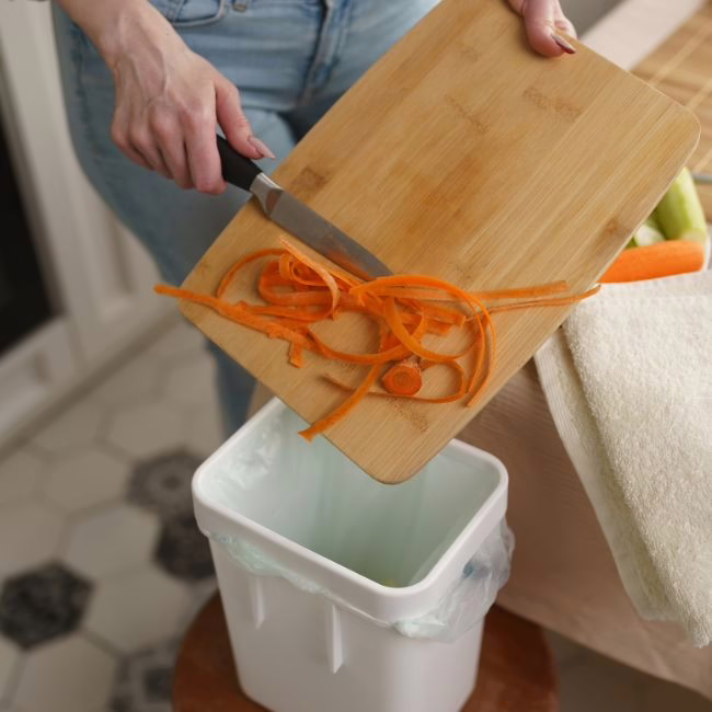 Keittiössä biojätteiden lajittelu erilliseen astiaan ja vienti biojätteen keräysastiaan.