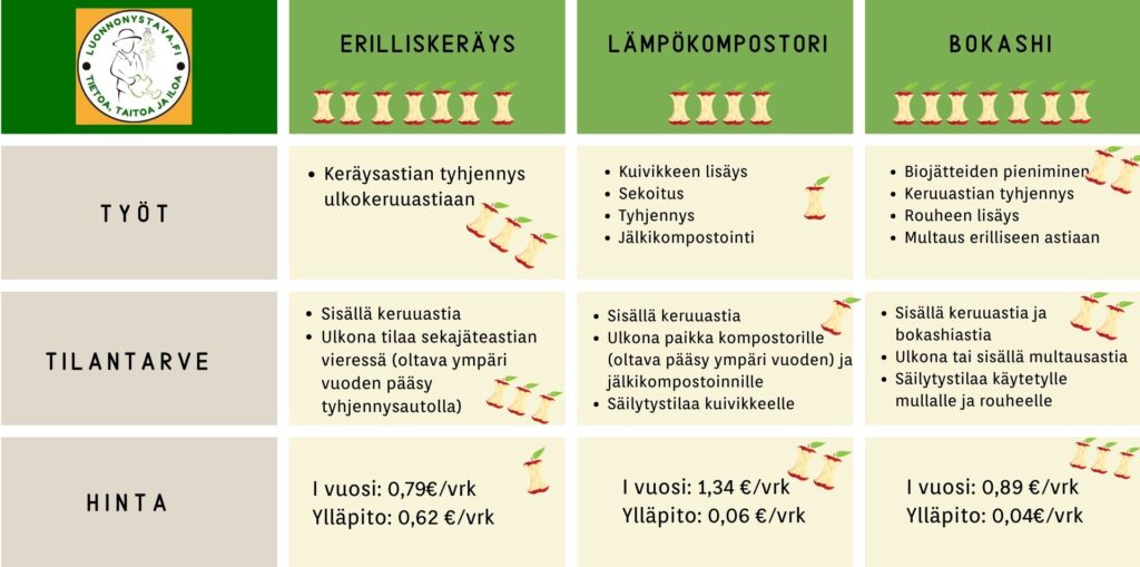 Tässä postauksessa vertaan nyt kolmea eri tapaa biojätteiden käsittelyyn, erilliskeräystä, lämpökompostointia ja bokashia. Kaikissa on hyvät ja huonot puolensa.