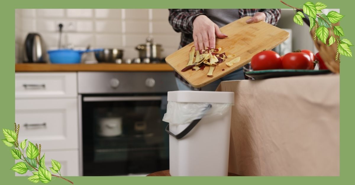 Keittiössä biojätteiden lajittelu erilliseen astiaan ja vienti biojätteen keräysastiaan.