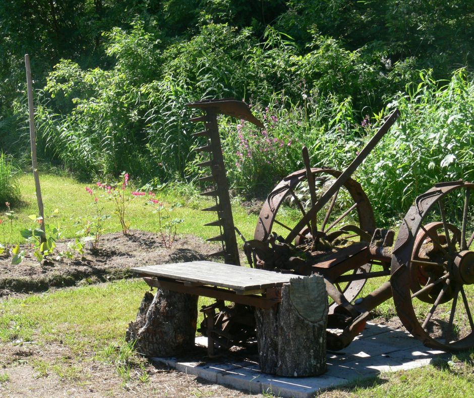 Teimme vanhasta hevosvetoisesta niittokoneesta penkin istutusalueen keskelle. Jokainen arkiaamu alkoi sillä, että kävelin kasvien lomassa tuolle penkille, istuin alas ja kuuntelin. Mietin päivän askareet, näin leppäkertun työssään, kuulin kimalaisen pörinän.