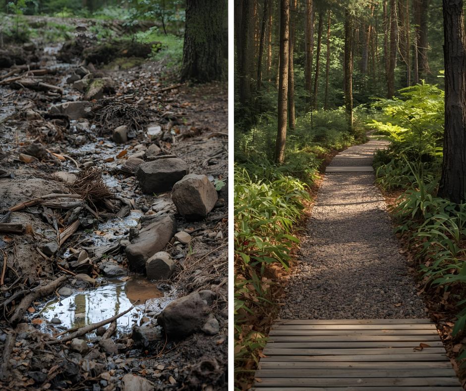 Ratkaisu: suunnittele polut etukäteen. Mieti, missä liikutaan eniten, ja vahvista reitit heti. Vaihtoehtoja on monia: hiekka, kivituhka, sorapolut tai pitkospuiden kaltainen ratkaisu. Valitse maastoon sopivin.