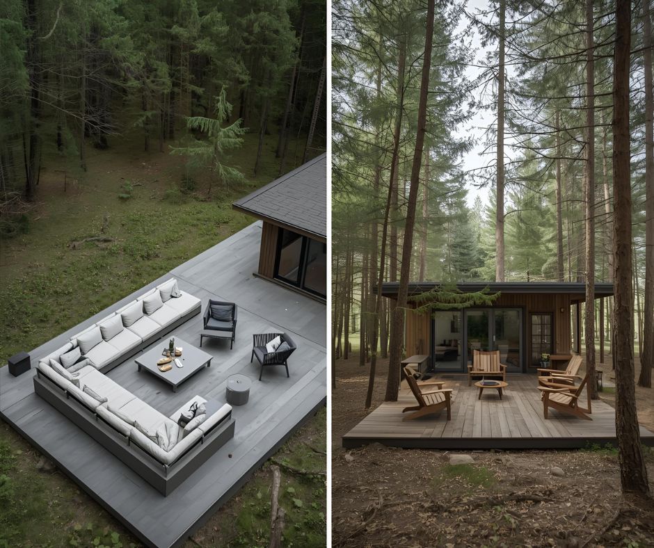 On houkuttelevaa rakentaa suuri terassi tai näyttävä patio, mutta liian massiiviset rakenteet rikkovat helposti metsän tunnelman. Lisäksi niiden rakentaminen voi vaatia isojen puiden kaatoa ja maanvaihtoja.