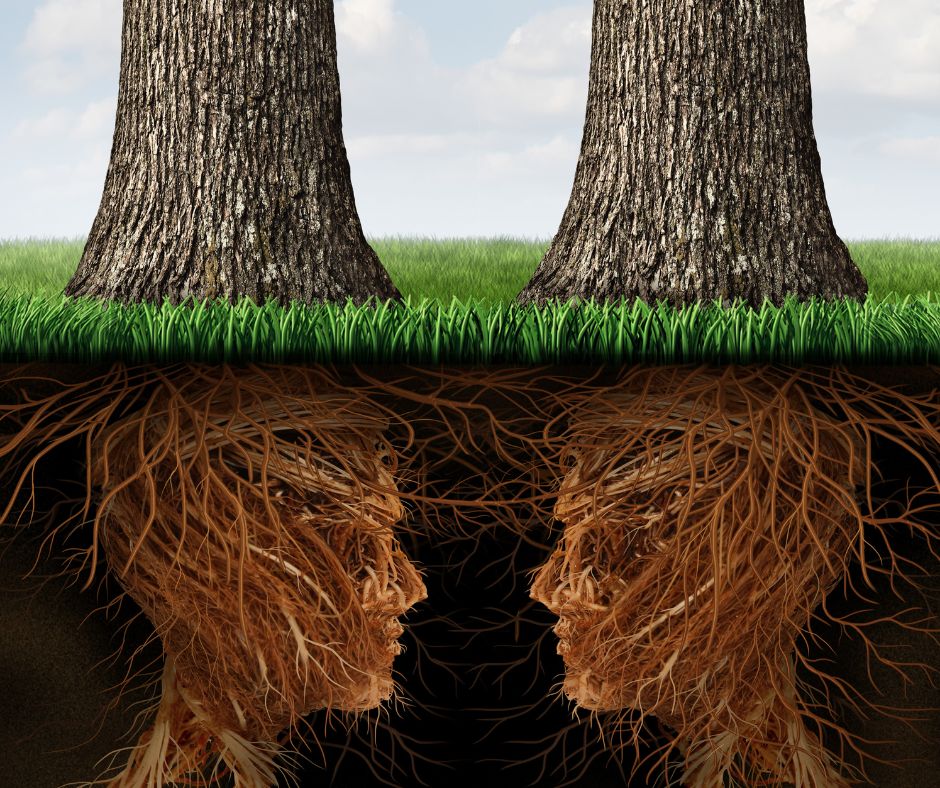 Sen juuret eivät toimi yksin, vaan ne rakentavat liittoutumia mykorritsasienten kanssa, jotka kuljettavat vettä ja ravinteita juurelta toiselle.