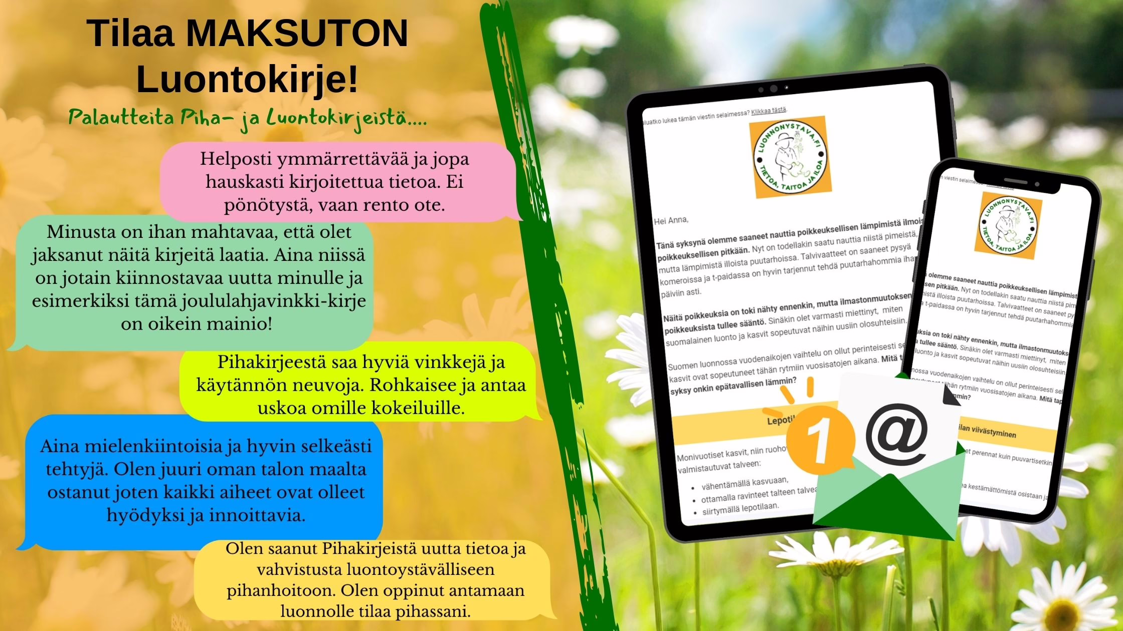 Luontokirje kilahtaa sähköpostiisi 1-5 krt/kk. Se on Luonnonystävän Tietopaketti, joka sisältää mm.: